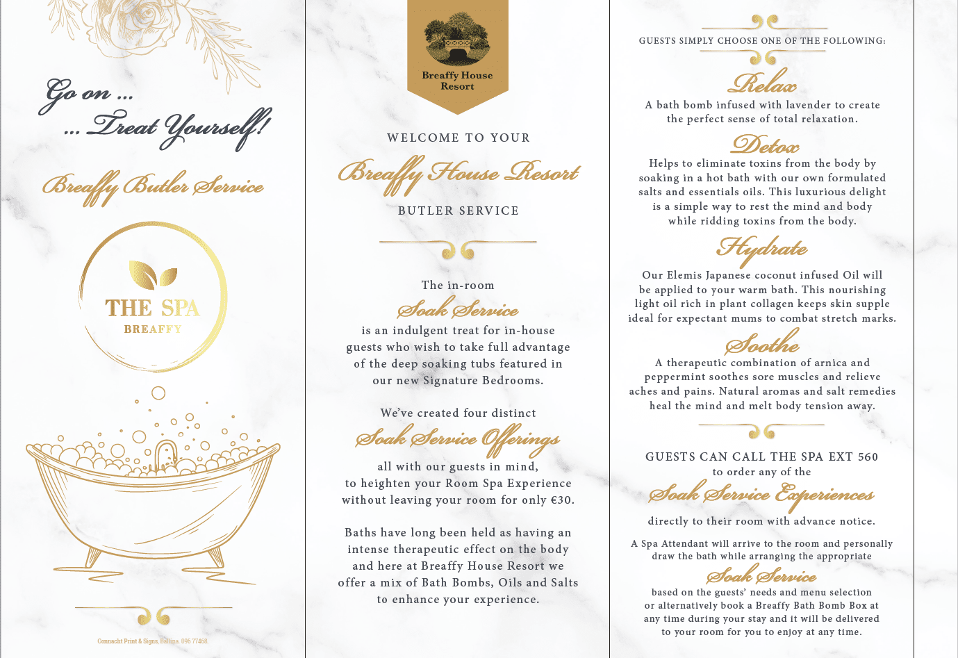 For all our Signature and Suite guests we offer our Breaffy Bath Butler service, where our guests choose from a 'menu' of pampering treats. The bespoke bath experience uses a mixture of essential oils and bubbles to create spa-worthy offerings, with a choice of three sessions. Each is tailored to create a relaxing environment.